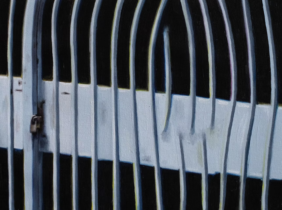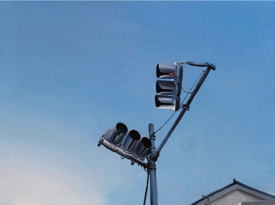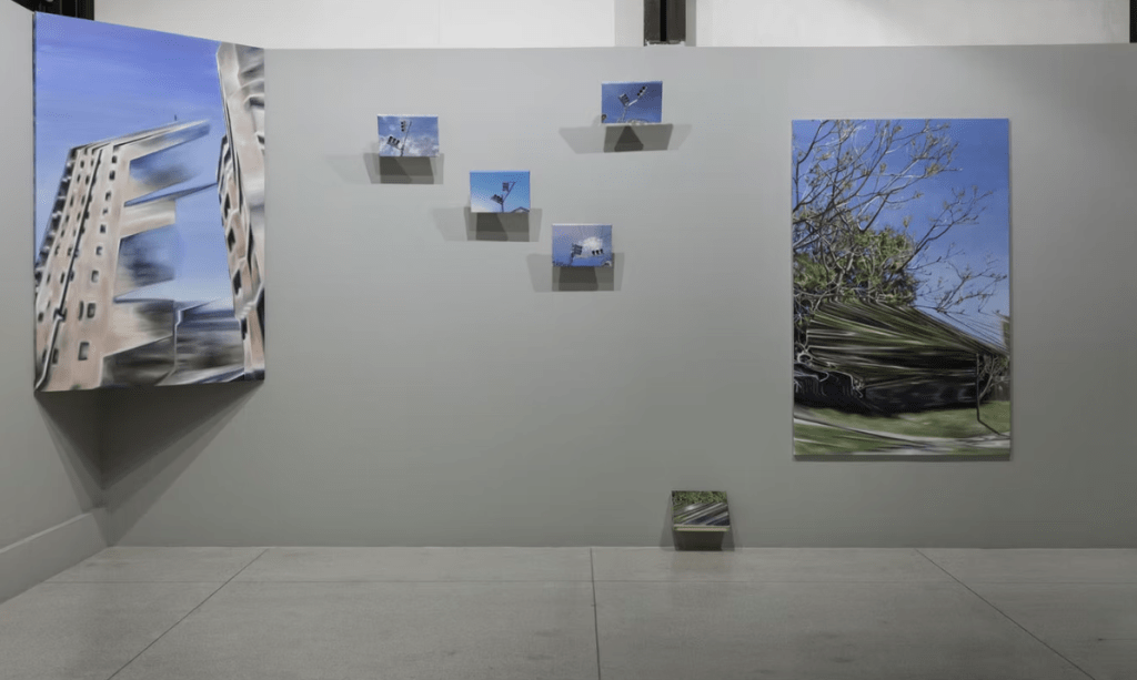 No es novedad que el arte contemporáneo se caracteriza por una fragmentariedad intencional como parte del proceso creativo y comunicativo. Y aquí radica lo perturbador de la ecdisis de la serpiente que se libera de un exceso innecesario porque en toda transformación siempre hay datos que se pierden o quedan censurados a la espera de que la cultura los vuelva a activar. La serpiente muda y deposita su piel muerta como la memoria altera y desecha datos. En esta selección de dieciséis pinturas —producidas entre 2019 y 2021— con detalles desencajados, fugaces, poco definidos o desenfocados —lo que la artista llama «imágenes glitcheadas»— los encuadres se vuelven evidentes. Son el resultado de una deriva virtual, que luego la artista a partir de una manipulación voluntaria realiza un recorte de precisión quirúrgica que anula aquellos elementos que nos podrían ubicar en un lugar o tiempo preciso o que darían cuenta de una presencia humana. Selecciona fragmentos que muestran la aceleración del tiempo, el error, y la cantidad de capas que hay en un archivo virtual. Son fragmentos de paisajes vacíos y deshabitados, de semáforos, de construcciones sin terminar, de vegetación, de postes de luz y cables de telecomunicaciones que solo dejan lugar para el silencio de un tiempo detenido de coordenadas imprecisas, que al agruparse en la sala y a partir del diseño expositivo refuerzan la dimensión de la fugacidad temporal.