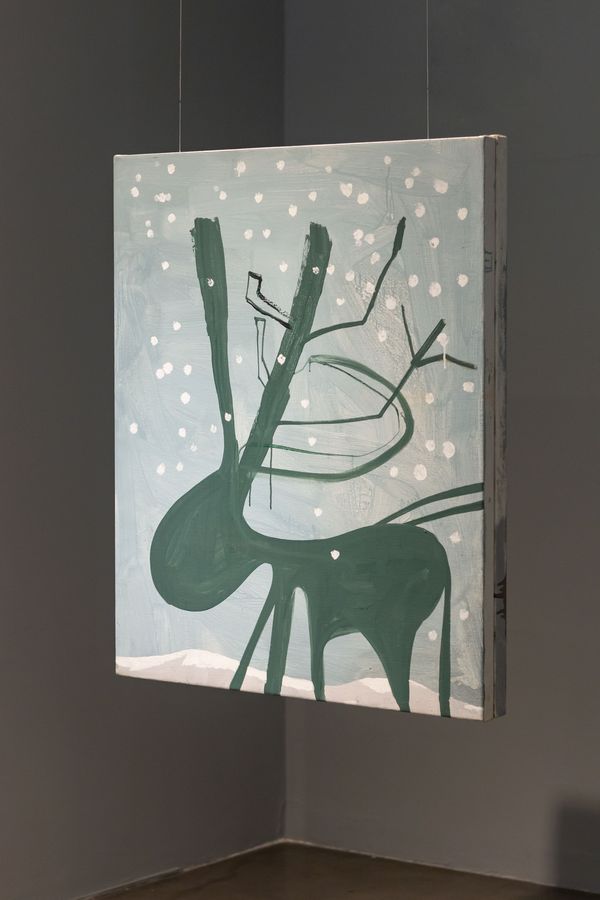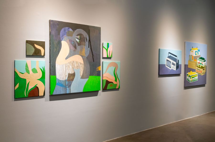 La iconografía de Mazza es particular y propia, la artista trabaja con textiles y bordados para crear obras figurativas que en una primera instancia parecen escenas de mujeres dóciles, pasivas y sensuales, pero a medida que nos acercamos encontramos un twist, los cuerpos curvilíneos y danzantes cortan, castran y matan. En esta serie, hay ciertos elementos que se repiten como leitmotiv: las tijeras y los cisnes. Las primeras, herramientas de costura por excelencia, utilizadas para crear y hacer cosas útiles, representantes del women’s work, son utilizadas en la iconografía de Mazza por los personajes femeninos cuyos cuerpos remiten a ninfas de la antigüedad o bien a las vírgenes presentes en las iglesias europeas, como armas de castración. El cisne, animal que desde la antigüedad y para muchas culturas, representa la espiritualidad, la luz, la pureza, la elegancia, la sabiduría divina y la purificación, aparece fragmentado en distintos lugares de la sala creando una atmósfera de extrañamiento. Hay un juego de contradicción que utiliza la artista constantemente para generar cierta incomodidad en el espectador e invita a reflexionar sobre la condición humana y la cultura en la que estamos insertos, donde los mitos de origen están atiborrados de hechos atroces como violaciones y concepciones erróneas del mal llamado amor romántico.