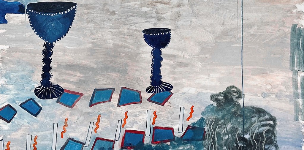 Hay un patrón de repetición entre las escenas. La artista se caracteriza por una obsesión por el registro, por intentar atrapar esos momentos mundanos y simples que se desvanecen con la misma rapidez con la que se consume una vela. La sala se transformó en una casa que contiene a sus pinturas, son rastros de un encuentro que acaba de concluir. Vestigios de una celebración privada de la que el espectador no formó parte. Sin embargo, lo hipnótico de sus obras invitan a jugar a la reconstrucción de lo que ya sucedió, como las manchas de comida y aureolas de vinos que quedan en los manteles después de una cena.