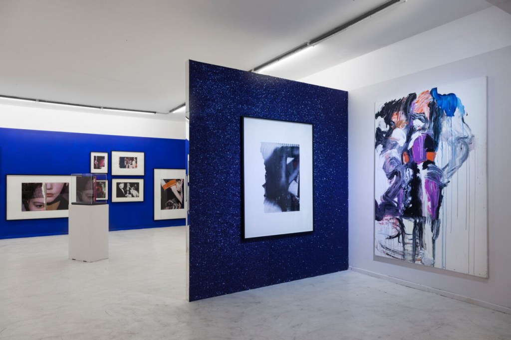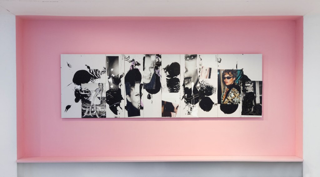 El ojo en la boca pone el acento en un tópico en boga, Stein nos enfrenta al gesto de tomar las imágenes que están a disposición de todxs y apropiarse de ellas para, en esa multiplicación y manipulación, concederles a cada una el valor de un original. La clave está en su mirada, en su selección, y en ese encuentro fortuito entre la imagen publicitaría y su ojo. El azar entra en juego en el proceso creativo. Stein recorta, interviene y confecciona. Su gesto reside en las sutilezas, en velar con pequeños dripping de pintura, aerosol, capas de material, brillantina y recortes mínimos. Cada imagen con la que trabaja el artista, de por sí, está cargada de deseo, pero un deseo que ahora tiene una doble distancia por la imposibilidad de la concreción de esa promesa de felicidad y por la veladura que el artista coloca. La propuesta reside en mirar lo que queda visible, convocando lo que ha desaparecido, examinando los rastros, las huellas que el artista deja en ese (mismo) acto de ocultar.