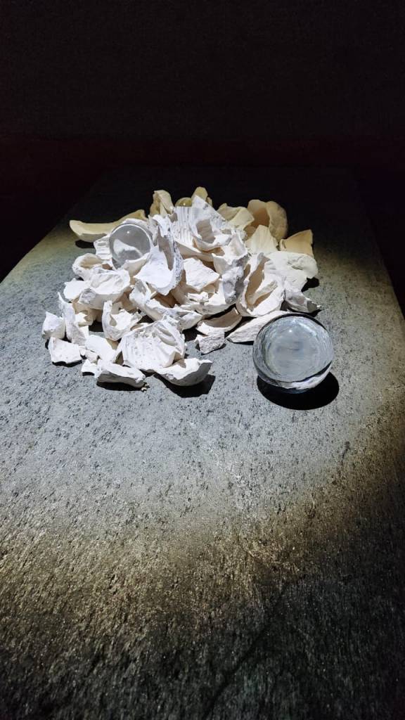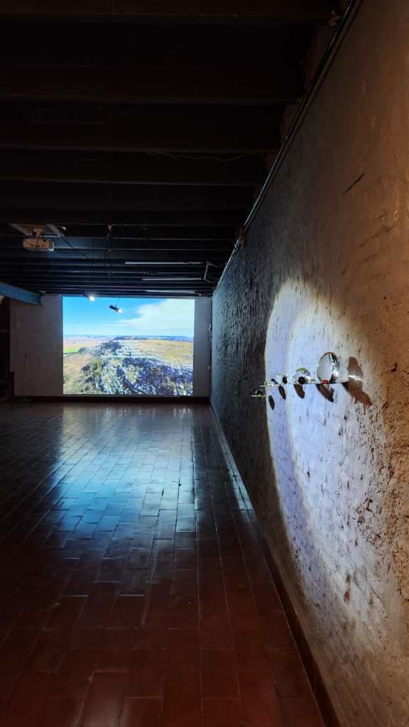 Al bajar las escaleras que nos llevan a la sala, la penumbra y el sonido ambiente crean la sensación de estar en una geografía pasada donde el tiempo se detuvo. Es como estar contemplando el efecto generado por los eclipses en la naturaleza, donde el sol desaparece por unos microsegundos, el viento anula su movimiento natural y las especies se paralizan frente al fenómeno como a la espera de una contemplación divina.